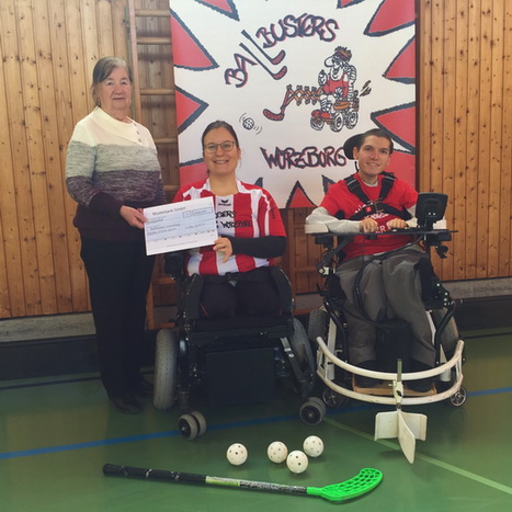 | | Auch Isolde Wahlichs Enkel Markus spielt seit elf Jahren bei dem Würzburger Team und führt die Mannschaft mittlerweile als Kapitän in die Spiele der Zweiten Bundesliga. Gemeinsam mit seiner Mannschaftskollegin Sandra Steiner nahm er den Spendenscheck in Empfang und dankte ausdrücklich: "Die Spende ermöglicht uns, die Unterkunft und Verpflegung bei unseren Auswärtsspielen zu finanzieren. Speziell die Fahrt zum Spieltag nach Bochum Anfang März ist jetzt gesichert. Herzlichen Dank!“ |